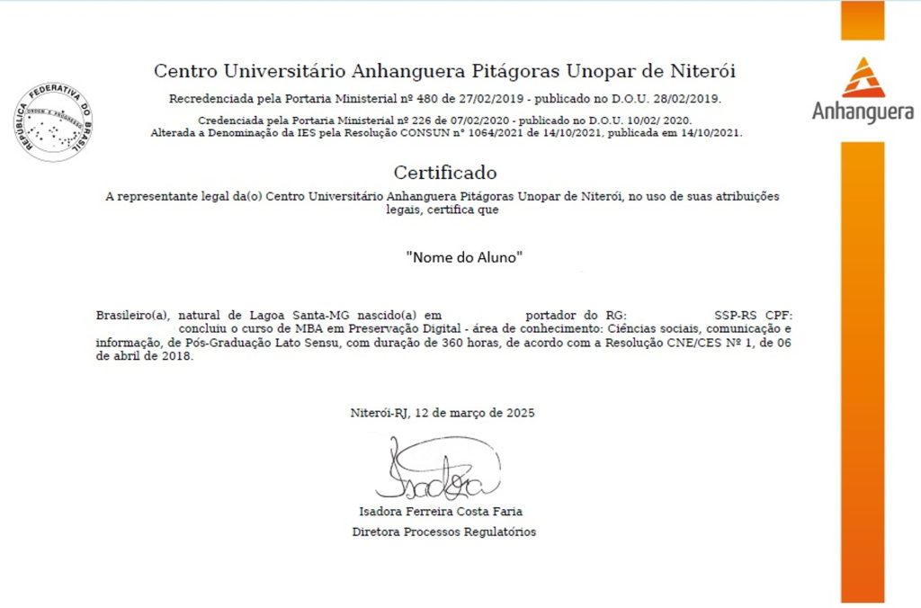 Nos diplomas são emitidas as informações pessoais do estudante, nome completo e Cadastro de Pessoa Física (CPF), título da especialização carga horária, conteúdo programático, assinatura da direção e coordenação e informações referentes sua validade de acordo com legislação vigente.