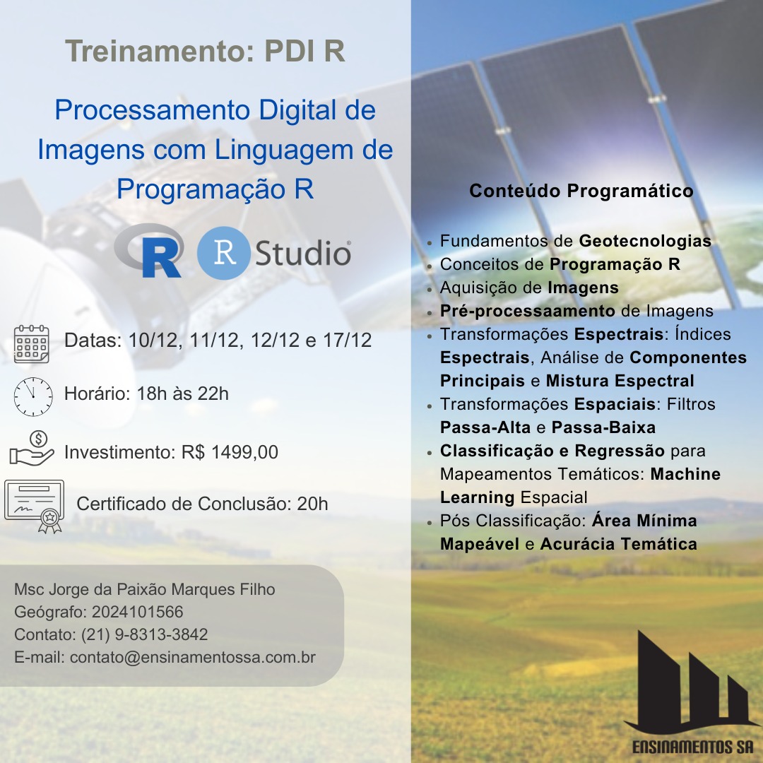 💻 Aulas ao vivo gravadas e disponíveis por 3 meses + certificado de 20 horas de carga horária + aplicações práticas em análises geoespaciais, classificações e regressões para diferentes mapeamentos temáticos.